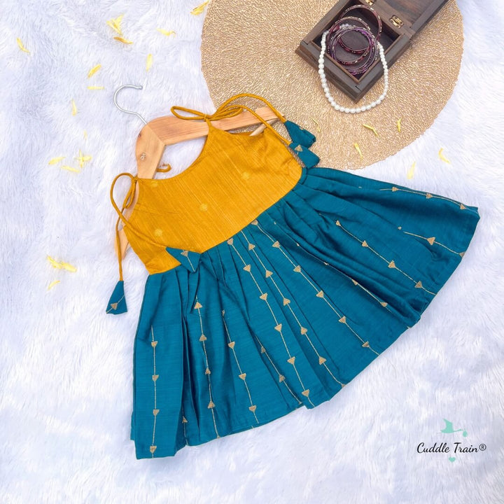 Marini- Knot Frock, Dupioni Silk Shoulder Knot Frock Introduce your little one to the charm of classic elegance, featuring a unique blend of traditional craftsmanship and contemporary design. The two-tone design reflecting the colors, this combination evokes an aura of natural beauty and elegance, accentuated with intricate golden patterns, makes this frock perfect for any festive or formal occasion. The delicate (Marini- Knot Frock) shoulder knot straps add a playful and stylish element, ensuring your child looks chic and feels comfortable.